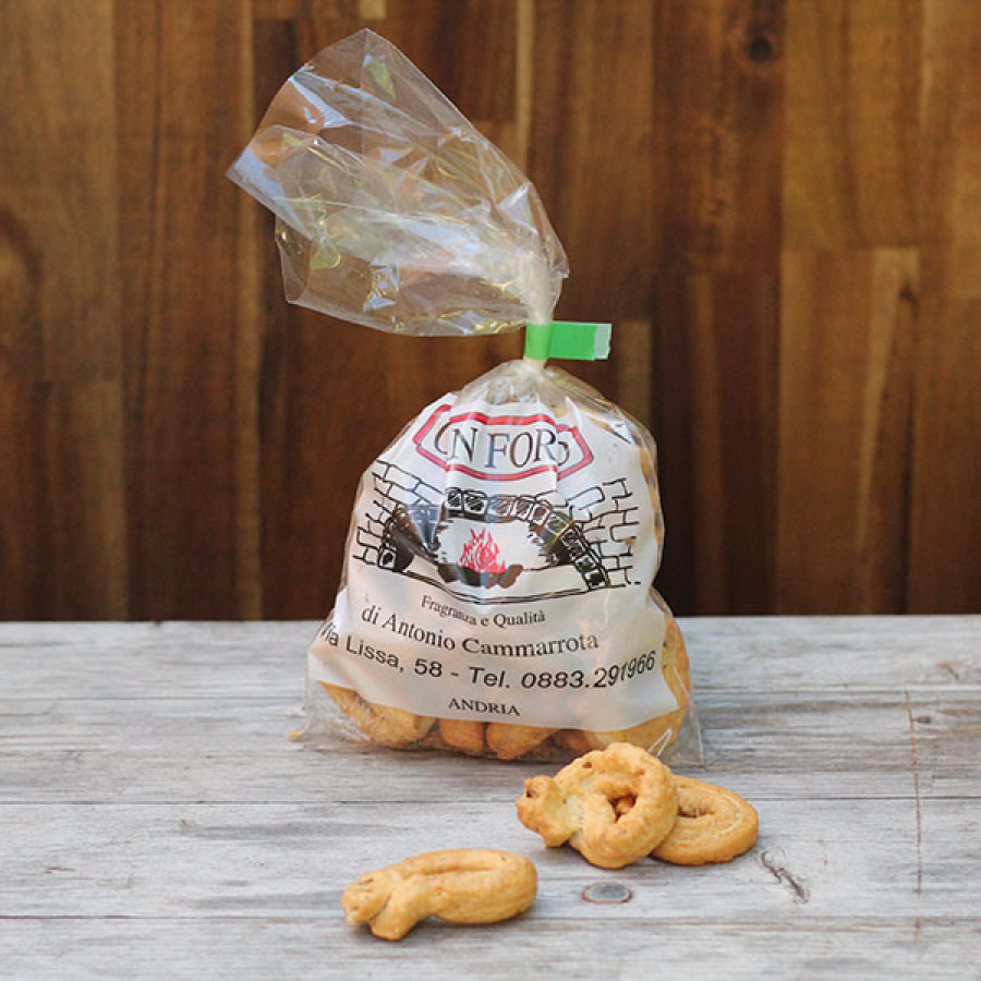 Handgemachtes Gebäck mit Olivenöl und Wildfenchelsamen, welches traditionell aus Apulien stammt. Passt wunderbar zu Wein und Käse.