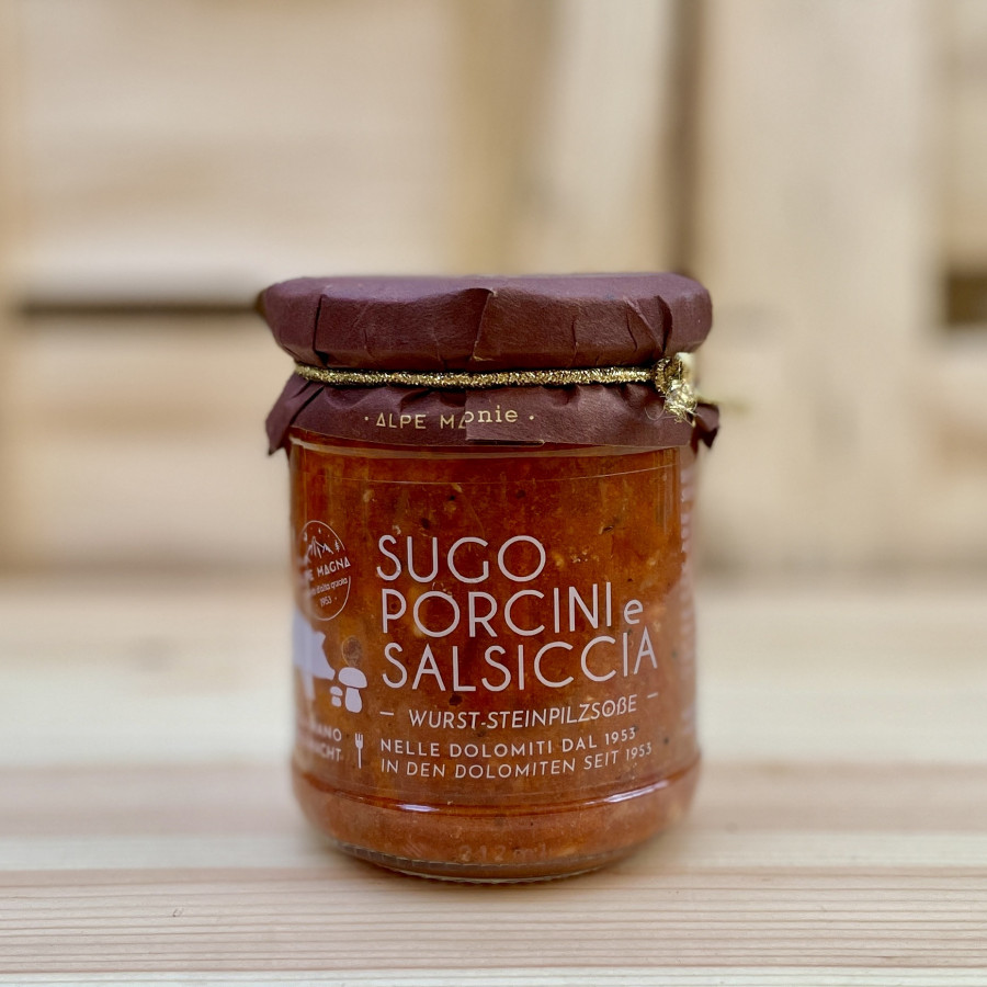 Feine Sauce für Nudeln mit Steinpilzen und Salsiccia, Rotwein aus dem Trentino, italienischen Tomaten und geräuchertem Speck. Die fruchtige, aromatische Sauce schmeckt als Begleitung zu Ravioli, Gnocchiund kurzen Nudelformaten.